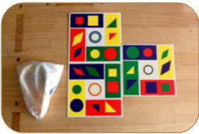 찾은 도형이 맞으면 자신의 카드에 맞는 위에 놓고 다음 플레이어에게 면 주머니를 준다.